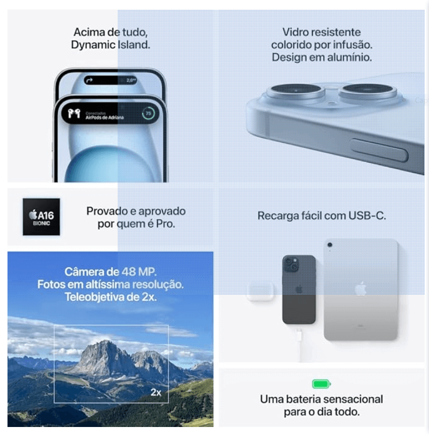 Esse conjunto torna o smartphone Apple iPhone 15 uma opção confiável para quem quer um aparelho rápido hoje e preparado para o futuro.